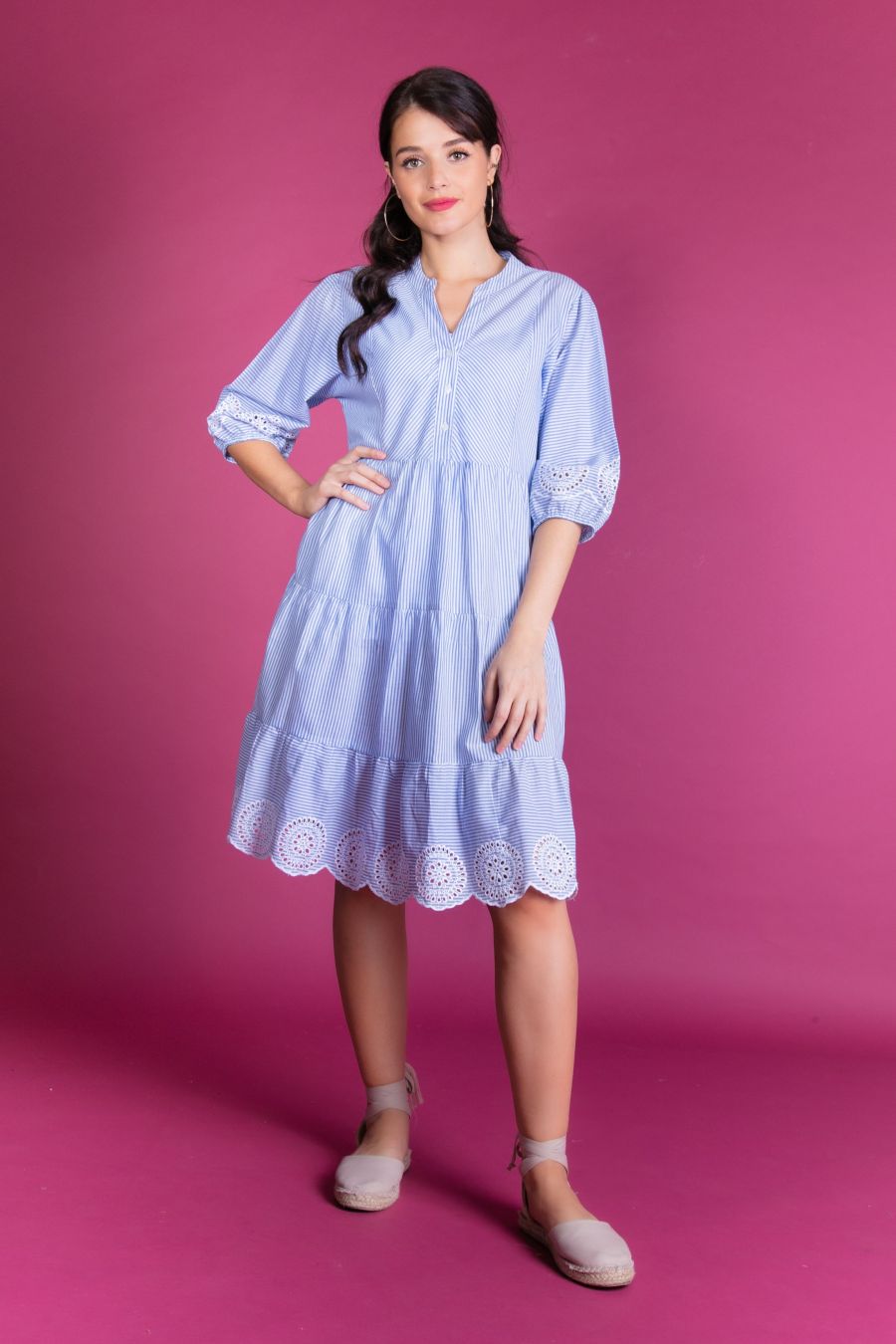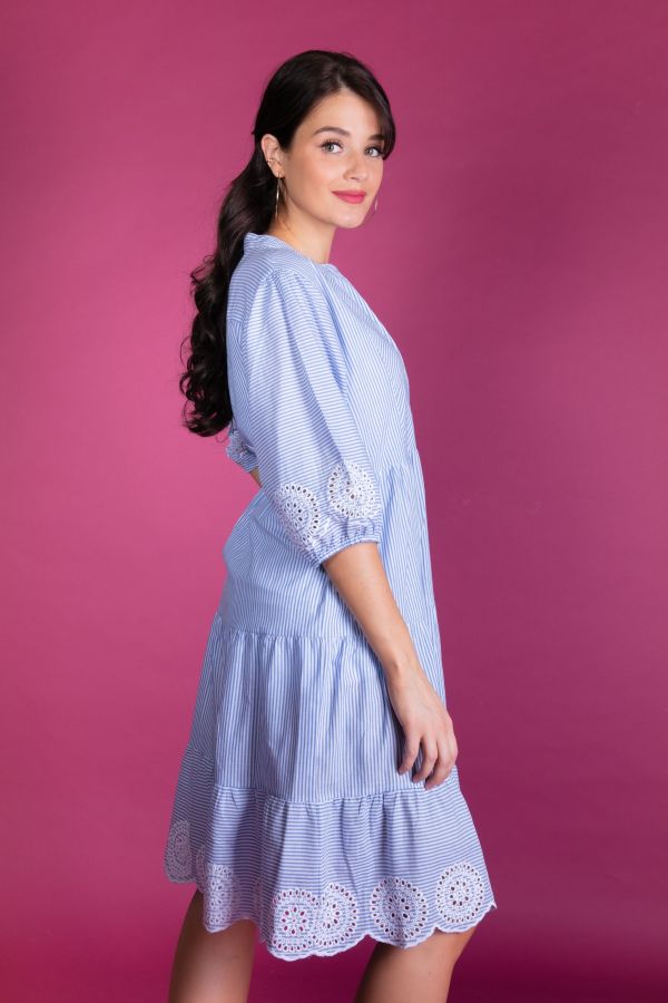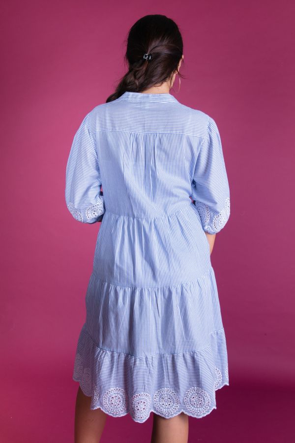 Midi tiered dress with waist seam and 3 tieres gathered skirt. The dress has standing collar with yoke at front and short button panel and with puffy sleeves. Blue white striped fabric with hole embroidery at hem and sleeve hem.
