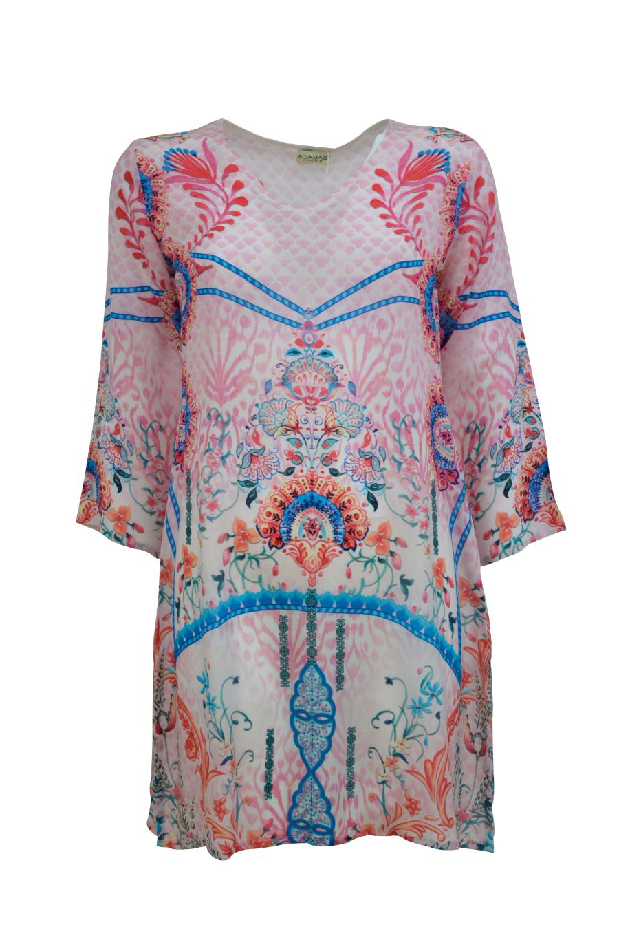 Straight tunic with V-neck, long sleeves and side slits. The print has ornaments in blue and red colors based on rose. 100% Viscose
