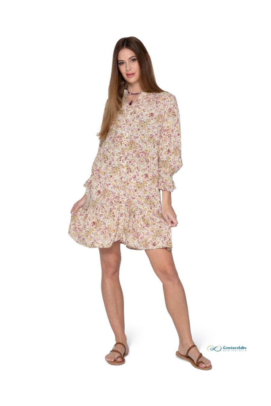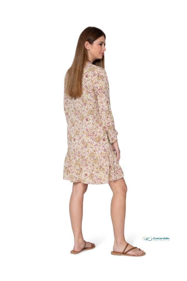 Short dress in straight shape with stand up collar and long sleeves with elastic and ruffle at sleeve. The viscose fabric has a romantic allover minimal flower print design in oldrose, green and beige colorway.