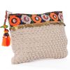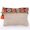 Handbag (clutch) made of cotton with zipper and a colorful border decorated with shells. Below the border are small ornamental gold plates. The zipper has tassels with pearls and a small green parrot.