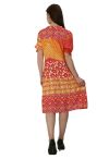 Short dress with several fabric retro prints combined with tiered skirtpart. Dress has V-neck with ¾ long sleeves with elastic cuffs. The fabrics are in colorfull colors like orange, red and pink.