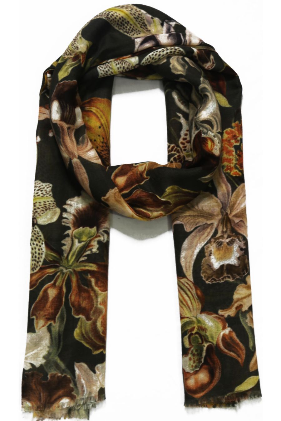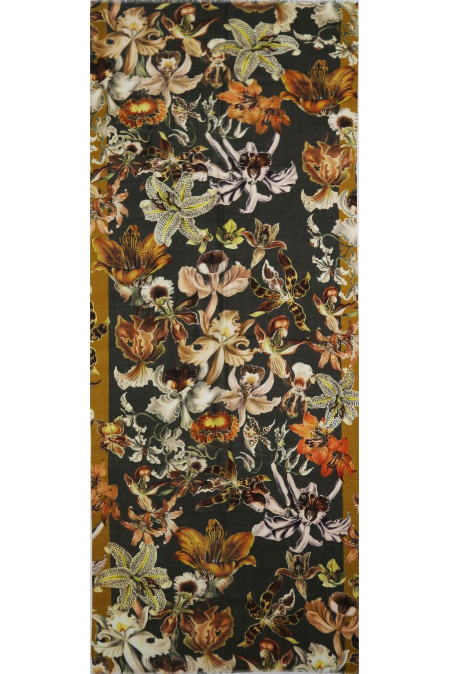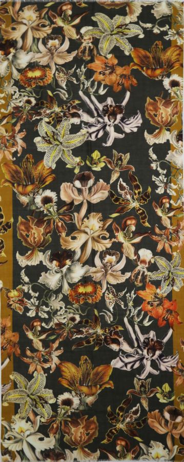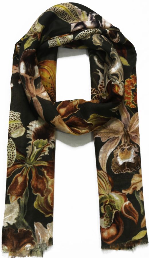 Wool Modal scarf with lilies in autumn colors like brown, curry , yellow and khaki.