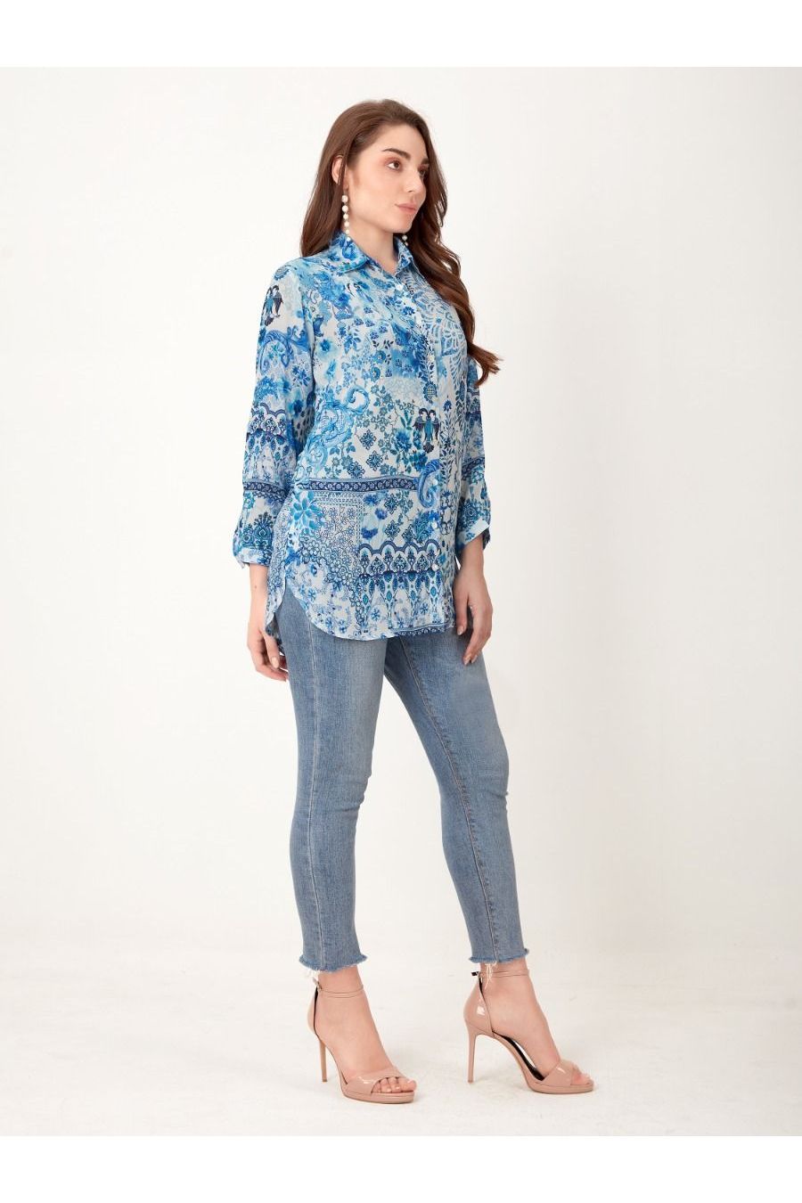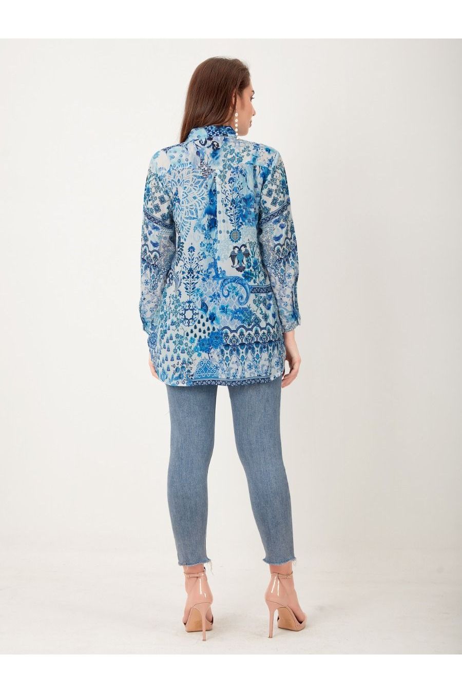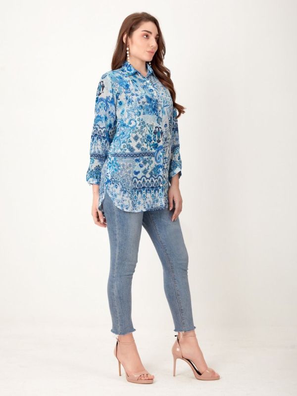 Shirtblouse with flowers and ornaments in blue white