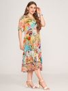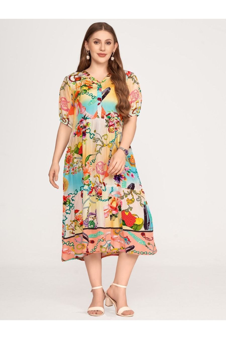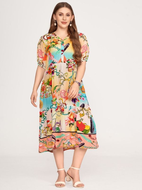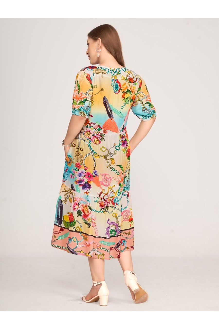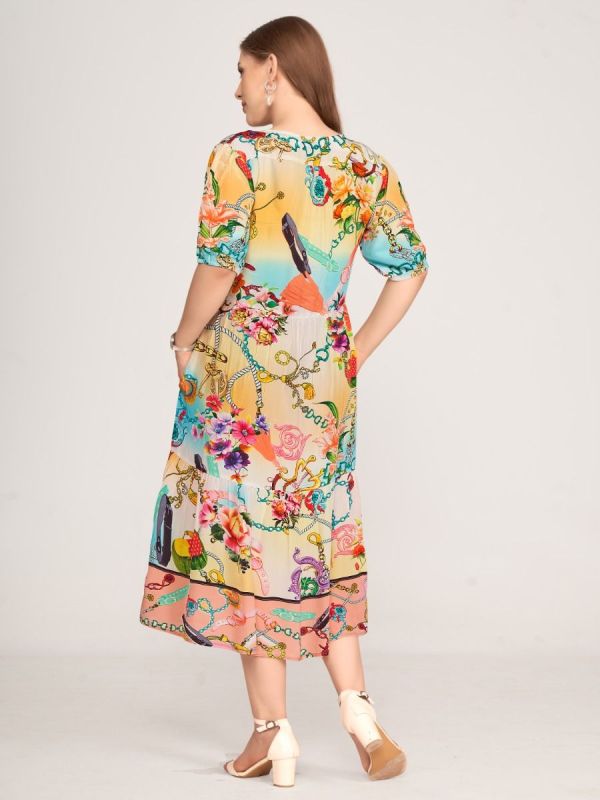 Wide dress with stand v-neckshape and short button panel at front. Short sleeves with elastic cuff and waistseam. With wide skirtpart below waistseam for comfortable wearing and with side seam pockets. The phantasy print with flowers, ornaments and chains are in yellow, turqoise and rose colorway. Length 115cm