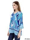 Tunic with round neck with smal slit and binding band with tassels. Sleeves are in ¾ length in raglan style. The print is in blue, turquoise and white geometrical print and at border with leopardprint.100% Viscose