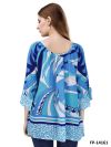 Tunic with round neck with smal slit and binding band with tassels. Sleeves are in ¾ length in raglan style. The print is in blue, turquoise and white geometrical print and at border with leopardprint.