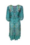 Wide dress with V-neck and ¾ short sleeves with elastic cuffs. Skirtpart below waist is wide for confortabel wearing. The based color is turqoise with pastel colored ornaments design. Length is 120cm.