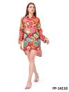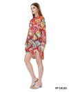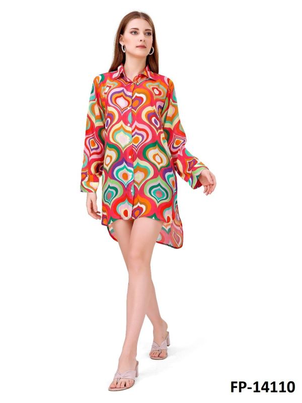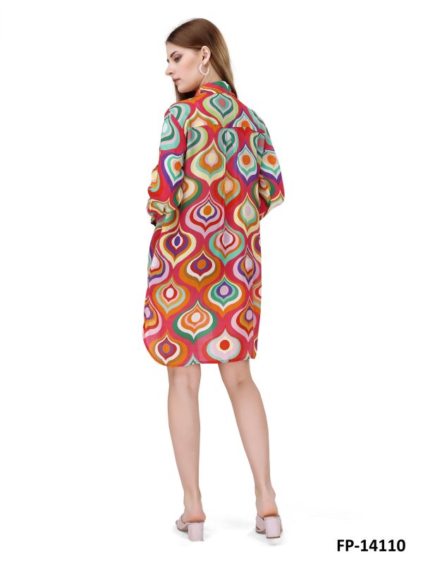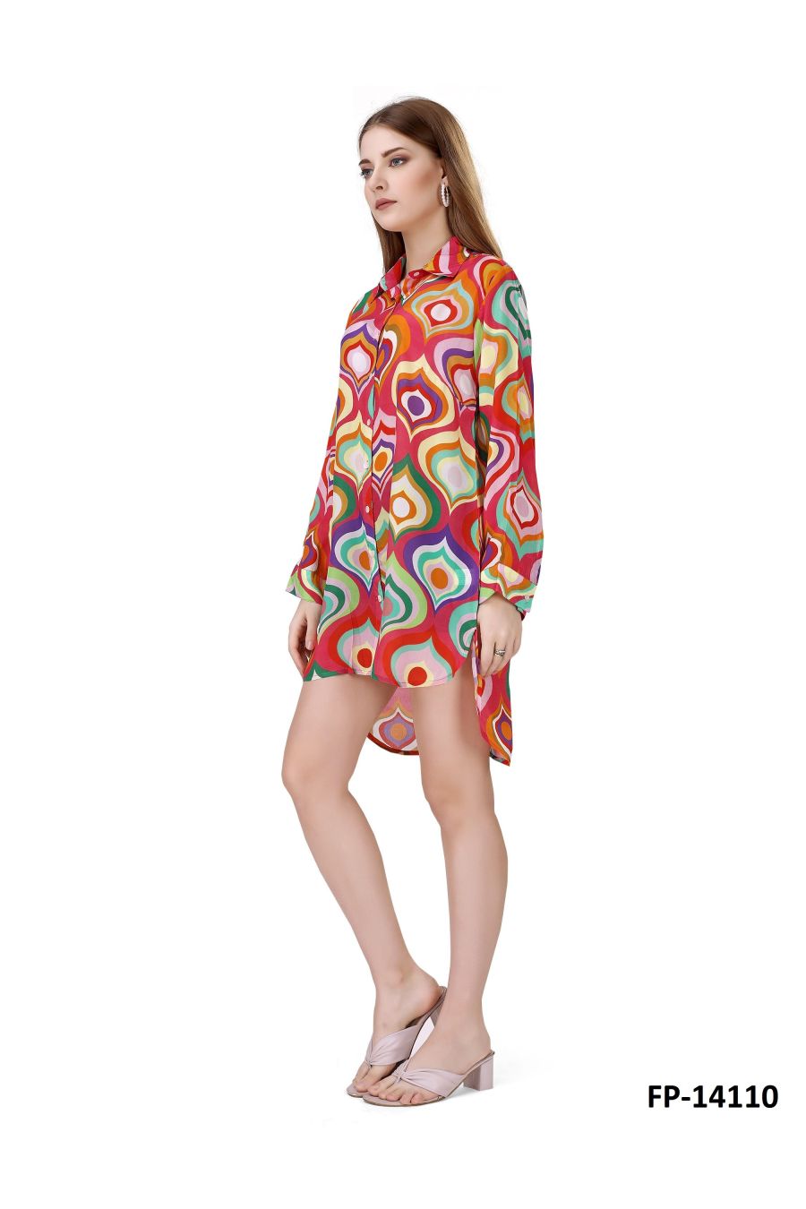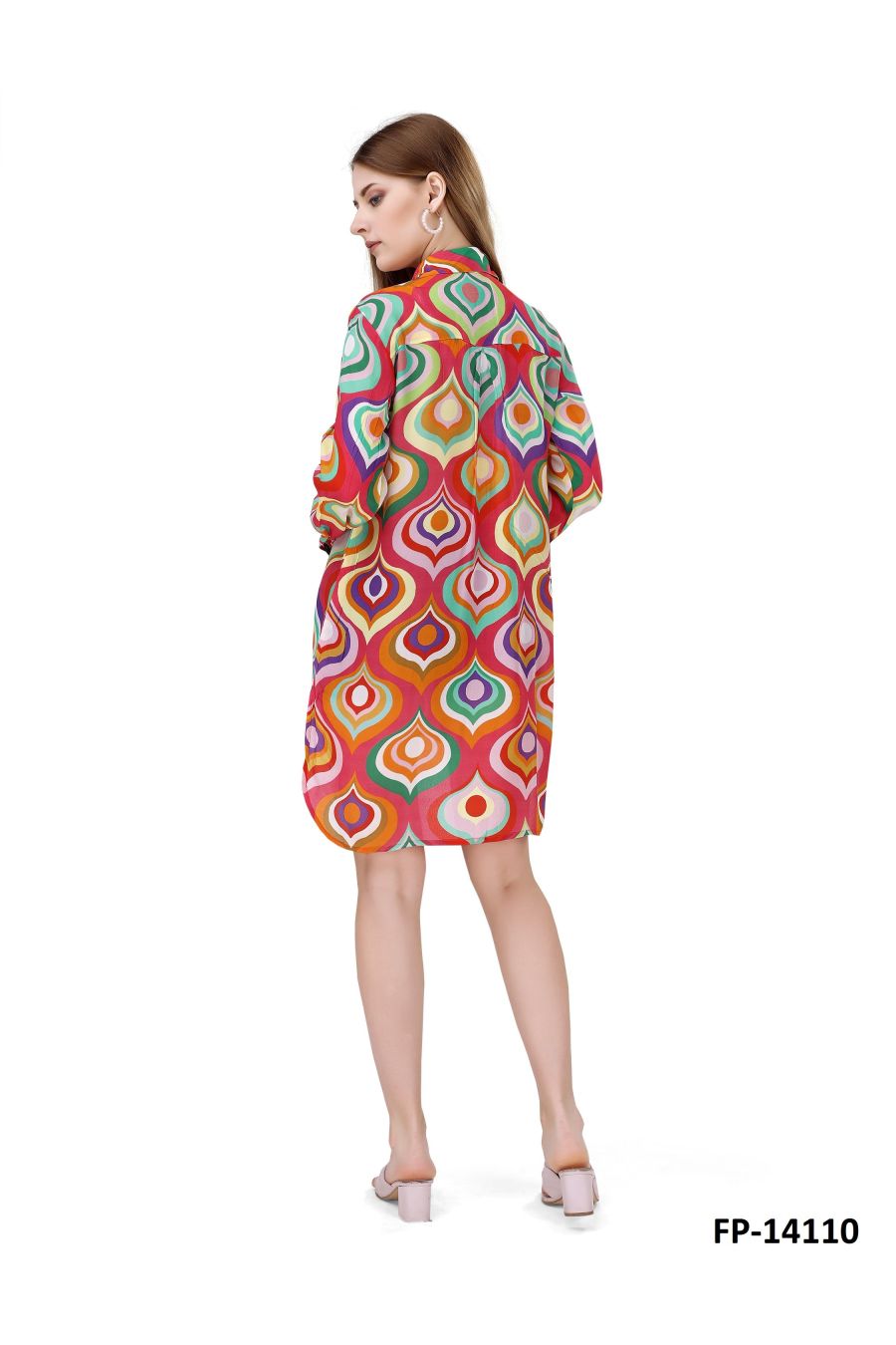 Short straight cut shirtblouse with collar and full button panel in center front and with long sleeves with cuffs.Front is shorter than back and with rounded side slits. The print is in colorfull retro design based on orange color.