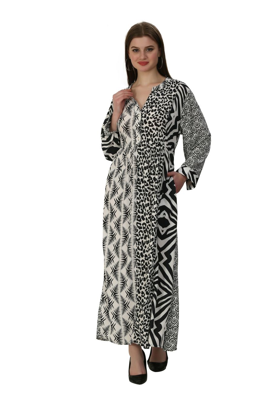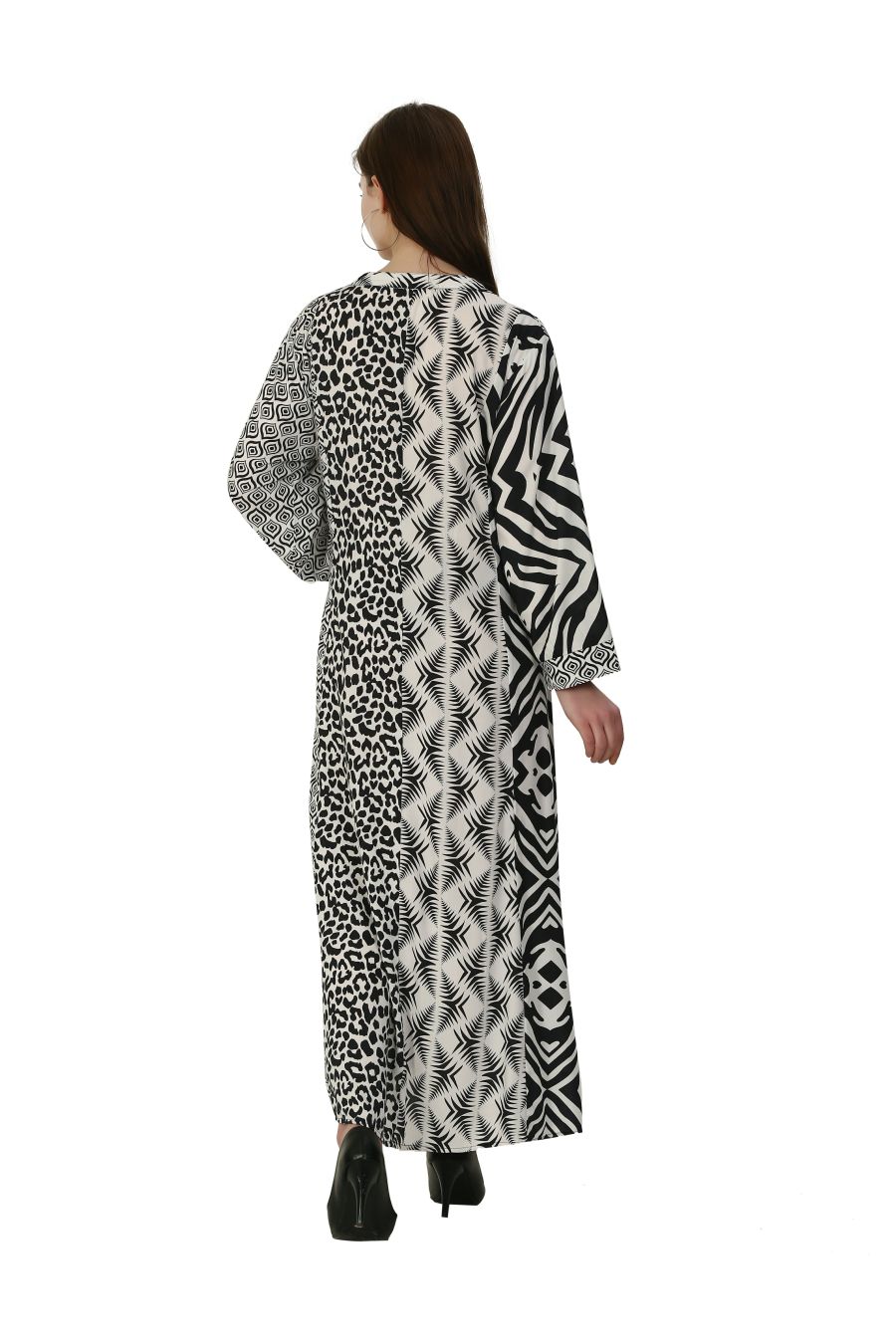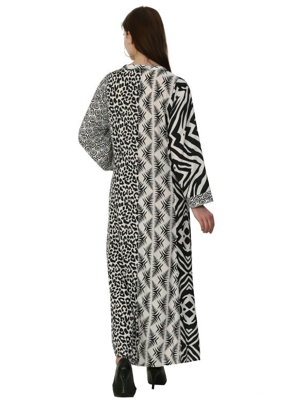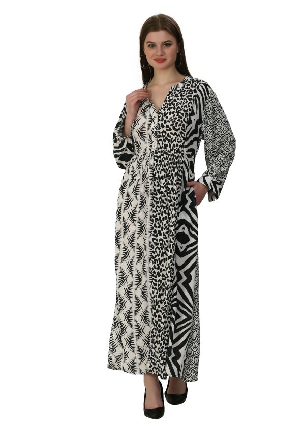 Long dress with several fabric prints in black and white. Dress has V-neck with long sleeves. The fabrics are in several black and white print designs.