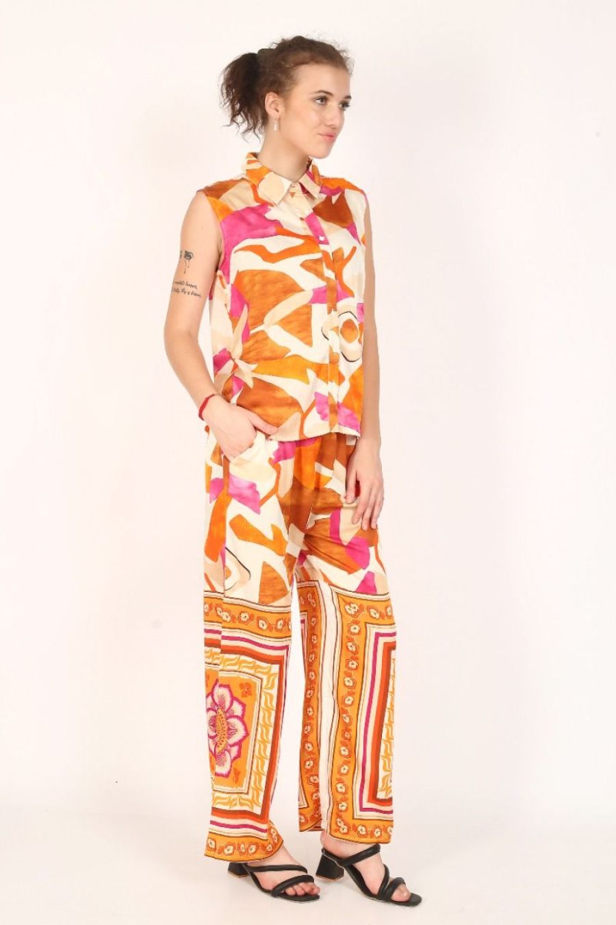 Wide cut trousers with elastic waistband and binding band and side pockets. The geometrical print in orange, brown and lilac is printed allover and the sleeves are printed with ornament and stripes print. border. 100% Cotton