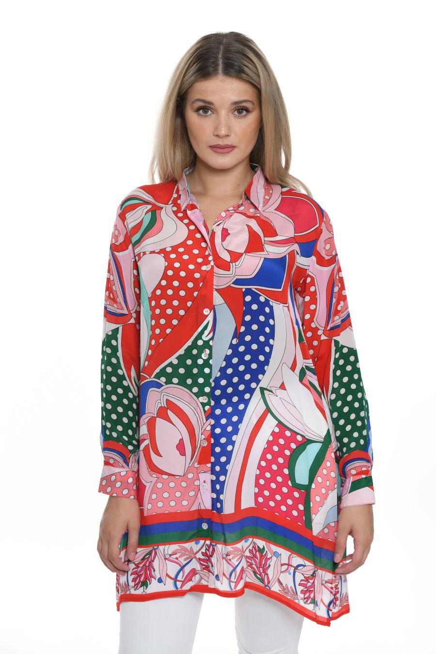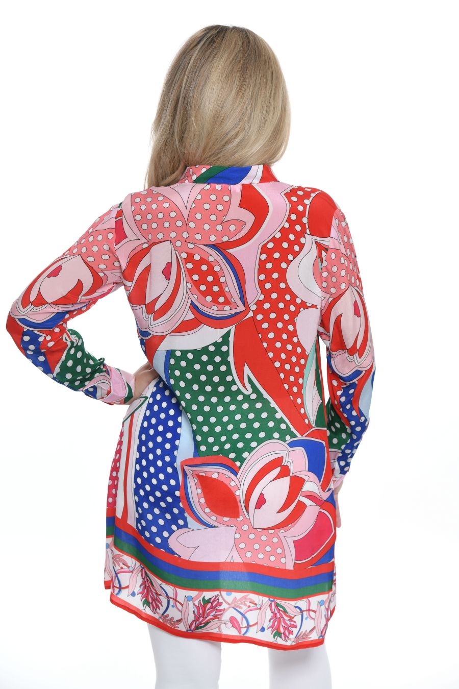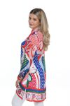 Tunicblouse with long sleeves and shirt collar and full button panel in center front. The colorfull geometrical print is combined with dots and vintage flowers in red blue and green colorway. At hem there is a border with print and red, blue and green stripes.